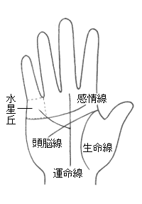 ただ、こうした運命線が手のひらにあれば、何らかの商売か会社の営業マン、あるいは科学的な方面で成功する確率がきわめて高いのです。ただし、水星丘へ向かう支線があまり細く弱々しい場合は、その成功が中途半端になるか、その人には実務的な能力があるくらいで、大きな成功は望めないと判断するほうがよいでしょう。成功者になるには、何と言っても支線が力強く水星丘に向かって昇っていることが、必要不可欠なのです。