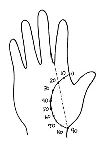 では、その流年法(年齢の見方)についてお話ししましょう。図を見てください。生命線の出発点を0歳とし、生命線の末端(手首にあたるところ)を90歳と考えます。そして生命線の全長のほぼ中心を40歳とみます。さらに、人差し指と中指の間から仮の垂直線を90歳のところに下ろして、上部で生命線と交差するところを20歳とします。