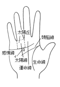 太陽丘に向かって太陽線が縦に伸びていて、その太陽線に左から斜めに昇る線(イロ)が結びついています。斜めに昇る線(イロ)の長さは人によって違い、どのあたりから斜めの線(イロ)が昇って、太陽線のどのあたりに結びつくかも人それぞれですから、図とそっくり同じでなくても気にしないでくださいね。