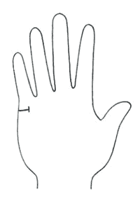 図を見てください。結婚線の末端に短い縦の線があり、この縦線のところで、結婚線がストップしたようになっています。縦線はきわめて短く、長くてもせいぜい4ミリぐらいですよ。例によって、後天的な運勢が表れやすい右手を中心に観察してくださいね。何本か結婚線がある場合は、その1本1本を観ていきましょう。