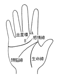 人差し指と中指の間から斜めの短かく細い線(AB)が現れています。これはその表す意味から考えて、金星環ではないという説もありますが、金星環の一種と考えて差し支えないでしょう。ABの長さは人によって多少違いますので、図より少し短くても長くてもくっきり刻まれていれば、このタイプですよ。いつものように後天的な運勢を表す右手を中心に観察しましょう。でも、右手に金星環がなかったら、先天的な運勢を表す左手も観てくださいね。実は、金星環はその人が生まれつき持つ性的欲望を表すとも言えますから、左手に現れていることも多いのです。